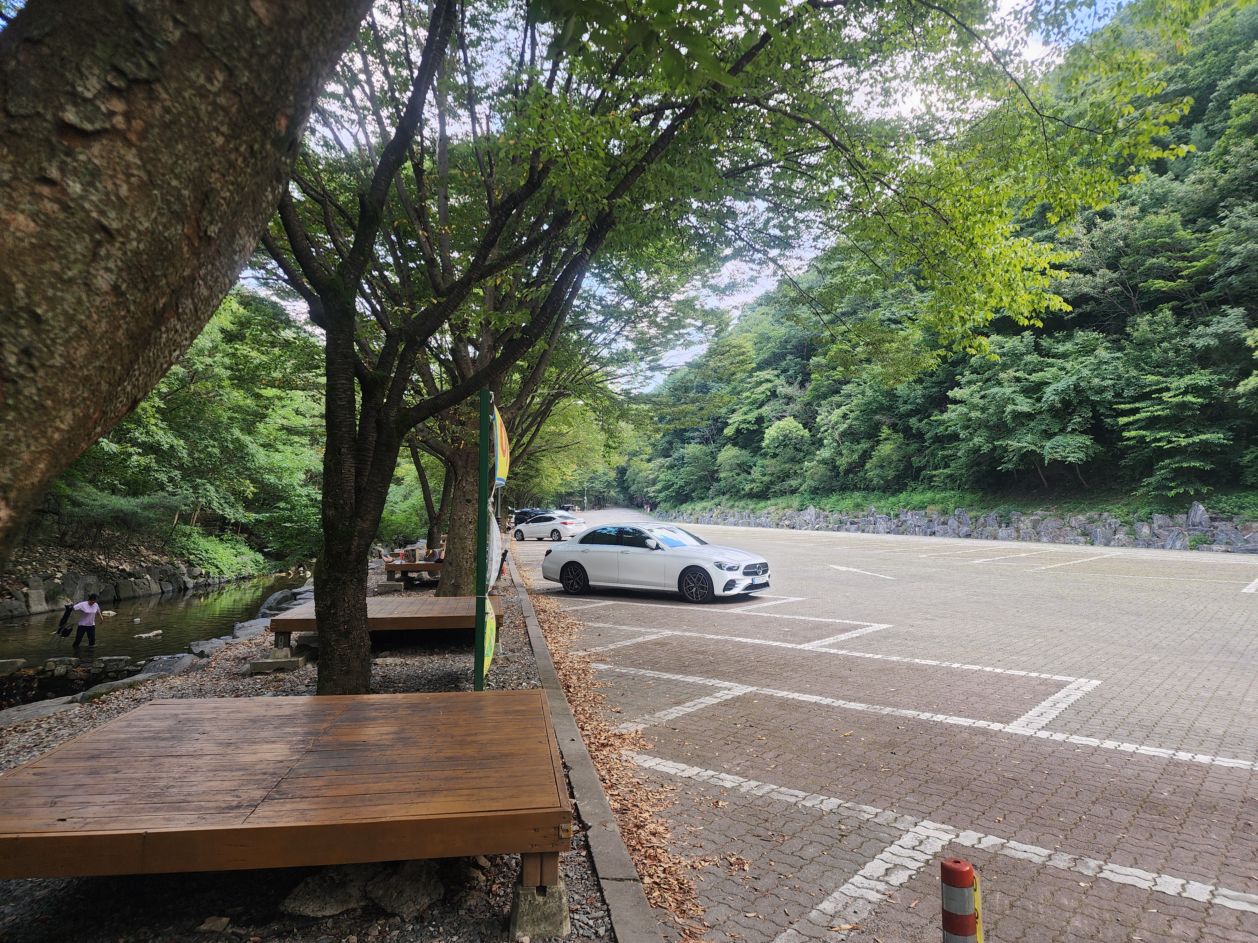 처음 들어서자마자 보이는 건 넓은 주차장이었습니다. 주차 공간이 평상 바로 앞에 있어서 짐 옮기기가 정말 편했어요. 아이스박스, 돗자리, 버너, 고기, 과일… 챙겨갈 게 많잖아요? 그런데 차에서 바로 내려서 평상 위로 옮길 수 있으니 불편함이 없었습니다.