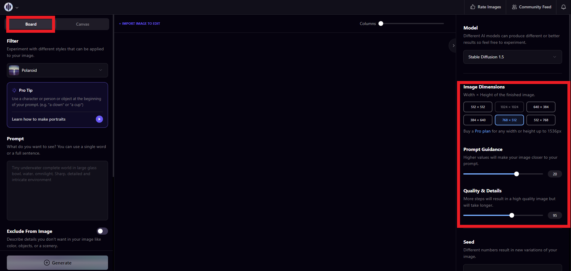 좌상단의 Board를 클릭하고, Image Dimensions는 768*512로 해줍니다.