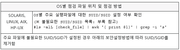 조치방법 | Step 1) 불필요한 SUID, SGID 파일 제거 Step 2) 아래의 목록 이외에 애플리케이션에서 생성한 파일이나, 사용자가 임의로 생성한 파일 등 의심스럽거나 특이한 파일의 발견 시 SUID 제거 필요 |