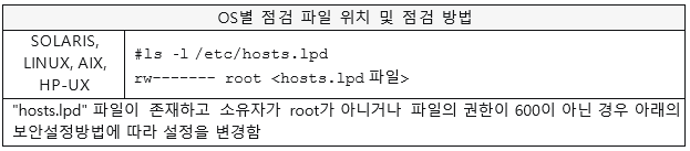 점검목적 | 비인가자의 임의적인 hosts.lpd 변조를 막기 위해 hosts.lpd 파일 삭제 또는 소유자 및 권한 관리를 해야 함 |