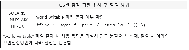 조치방법 | world writable 파일 존재 여부를 확인하고 불필요한 경우 제거 |