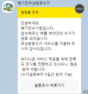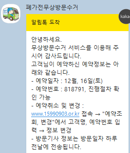 예약 시 문자, 수거 완료 후 문자를 보내주는 등 체계적으로 관리되고 있습니다.