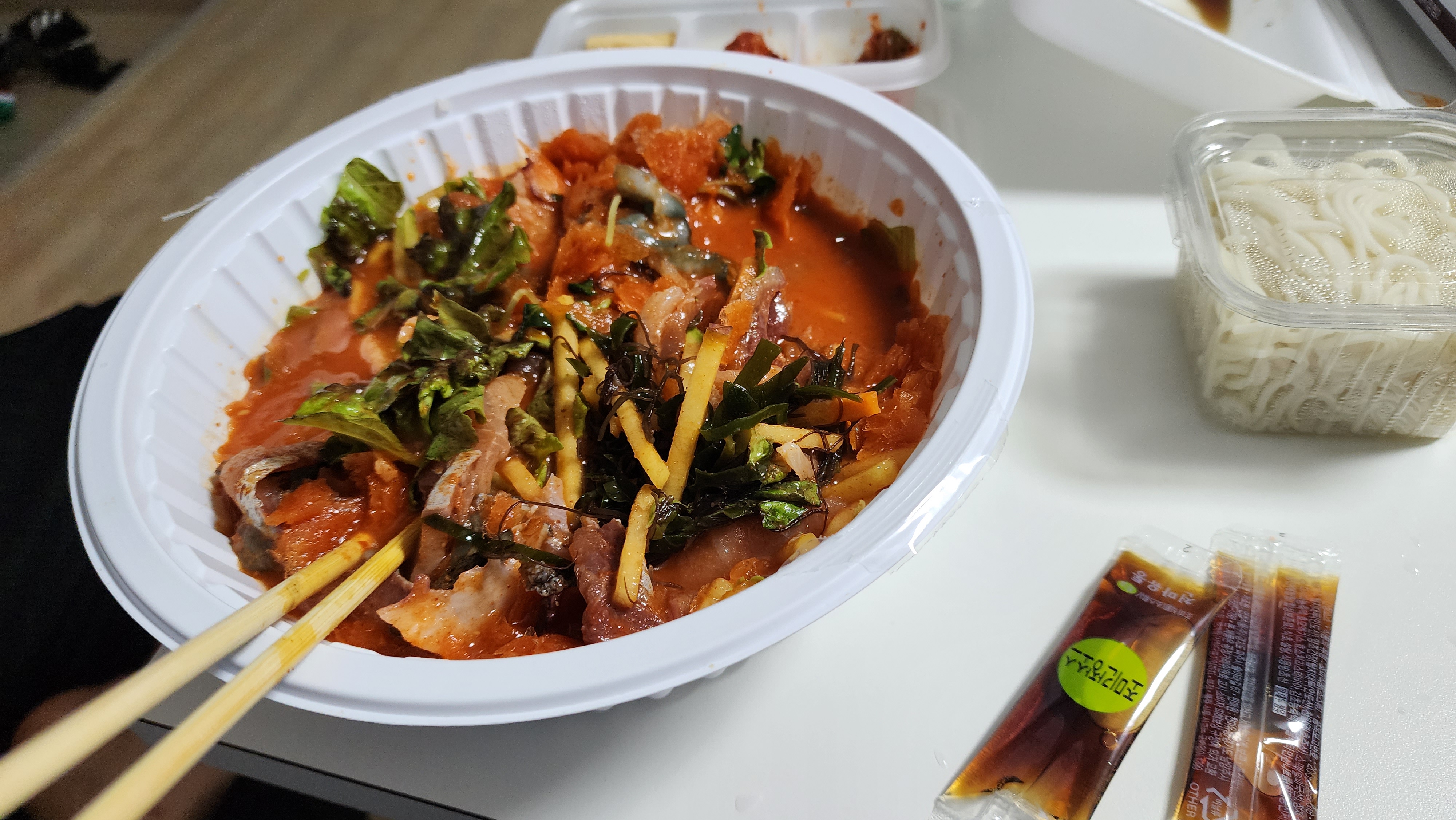 저녁에는 바비큐 해 먹기가 귀찮아서 물회를 포장해서 먹었습니다.