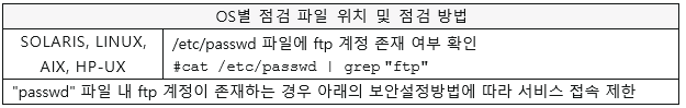 점검목적 | 실행중인 FTP 서비스에 익명 FTP 접속이 허용되고 있는지 확인하여 접속허용을 차단하는 것을 목적으로 함 | |