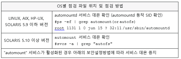 | 참고 | ※ NFS(Network File System): 원격 컴퓨터의 파일시스템을 로컬 시스템에 마운트하여 마 치 로컬 파일시스템처럼 사용할 수 있는 프로그램 ※ NFS 서비스 사용 금지가 원칙이나 불가피하게 사용이 필요한 경우 NFS v2, v3은 평문으로 전송되는 취약점이 있기 때문에 암호화되는 v4를 사용하는 것을 권고함 |