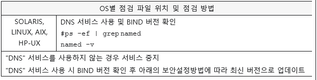 조치방법 DNS 서비스를 사용하지 않을 경우 서비스 중지, 사용할 경우 패치 관리 정책수립하여 주기적으로 패치 적용