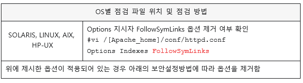| 조치 시 영향 | 심볼릭 링크를 이용하여 웹페이지가 구성되어 있는 경우 해당 서비스가 실행되 지 않을 수 있음. 웹서버의 DocumentRoot 폴더 내에 심볼릭 링크가 설정된 파 일 검토 필요 |
