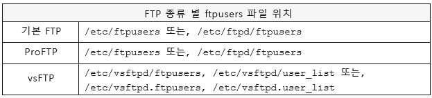 | 보안위협 | 해당 파일에 대한 권한 관리가 이루어지지 않을 시 비인가자의 FTP 접근을 통해 ftpusers 파일에 계정을 등록하고 서버에 접속하여 침해사고가 발생할 수 있음 |