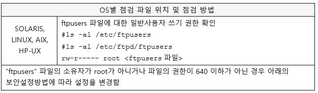 | 점검내용 | FTP 접근제어 설정파일에 관리자 외 비인가자들이 수정 제한 여부 점검 |
