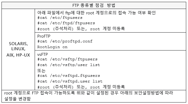점검목적 | root의 FTP 직접 접속을 방지하여 root 패스워드 정보가 노출되지 않도록 하기 위함 |