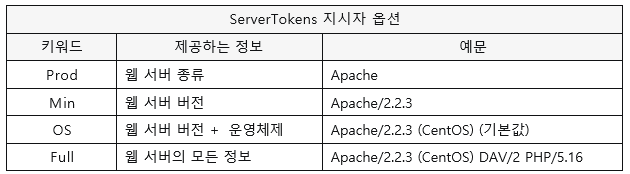 | 판단기준 | 양호 : ServerTokens Prod, ServerSignature Off로 설정되어있는 경우 |