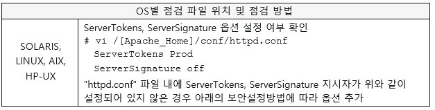 | 조치방법 | 헤더에 최소한의 정보를 제한 후 전송 (ServerTokens 지시자에 Prod 옵션, ServerSignature 지시자에 Off 옵션 설정) |
