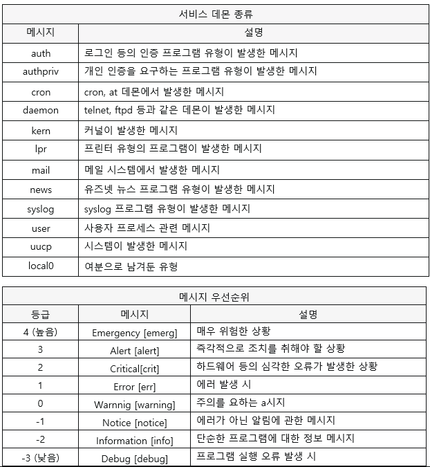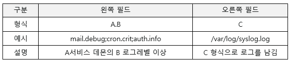 | Step 3) 위와 같이 설정 후 SYSLOG 데몬 재시작 #refresh -s syslogd 또는, #ps -ef | grep syslogd root 7524 6970 0 Apr 23 - 0:02 /usr/sbin/syslogd #kill -HUP [PID] • HP-UX Step 1) vi 편집기를 이용하여 "/etc/syslog.conf" 파일 열기 #vi /etc/syslog.conf Step 2) 아래와 같이 수정 또는, 신규 삽입 *.notice /var/adm/syslog/syslog.log *.alert /dev/console *.emerg * Step 3) 위와 같이 설정 후 SYSLOG 데몬 재시작 #/sbin/init.d/syslogd start 또는, #ps -ef |grep syslogd root 7524 6970 0 Apr 23 - 0:02 /usr/sbin/syslogd #kill -HUP [PID] • Syslog.conf 파일 형식 ![]() [오른쪽 필드의 로그 형식 종류] 1. var/log/syslog.log -> 해당 파일에 로그를 기록 2. dev/console -> 모니터 화면과 같은 지정된 콘솔로 메시지 출력 3. user -> 지정된 사용자의 화면에 메시지 출력 4. * -> 현재 로그인되어 있는 모든 사용자의 화면에 메시지 출력 5. @192.168.0.1 -> 지정된 호스트로 로그 전송 ![]() |