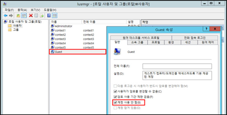 Step 1) 시작> 실행> LUSRMGR.MSC> 사용자> GUEST> 속성