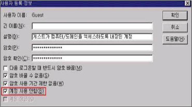 Step 1) 시작> 프로그램> 관리도구> 도메일 사용자 관리> Guest 계정 선택> 등록정보 Step 2) "계정 사용 안함"에 체크