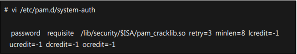 점검내용 | 시스템 정책에 사용자 계정(root 및 일반 계정 모두 해당) 패스워드 복잡성 관련 설정이 되어 있는지 점검 |